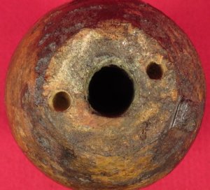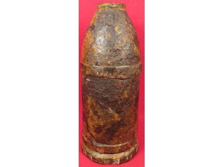 This excavated Confederate 3 inch Read shell is in very good condition and still retains its copper sabot and fuse adaptor. The sabot on this fired example clearly shows seven lands and grooves as formed from the rifling inside the cannon tube. According to Peter George, co-author of "Field Artillery Projectiles of the American Civil War", the fact that there are seven lands and grooves on the sabot indicates that this shell was fired from a captured Yankee three inch ordnance rifle. He also advised that the construction of its copper sabot indicated that this example was a late war 1864 manufactured shell. This shell was lightly clear coated many decades ago with much of the coating now worn away. About a quarter inch below the bottom of the fuse adaptor, on one side of this shell, are the remnants of its lathe chock. These remnants are visible in the top or fuse adaptor view of this shell, at the 3:30 position, in the additional enlargement pictures. This fine Confederate shell has been disarmed, has no repairs, and is ready for display. It will be an excellent addition to any excavated Civil War artillery or general relic collection. Approximate weight is 6.8 lbs and the length is 7 1/4 inches.