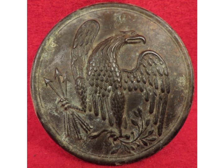 Use: Federal. Eagle plates, also known as breast plates, shoulder belt plates, and cross belt plates, depicting a raised eagle clutching arrows in its right talon and an olive branch in its left. They were attached to the cross-belt sling that supported the soldier's cartridge box. They were primarily ornamental and proudly worn by Union soldiers with the belt slung over the shoulder and across the chest. See the additional images in this listing for an image showing its use.