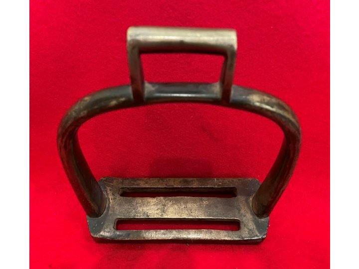 This heavy non-excavated M-1833 Grimsley light artillery saddle stirrup is in very good condition. It is constructed of cast brass which has a darkening dull brass patina. There is slight period wear with minor nicks primarily on one side and on the bottom of the tread. It measures approximately 5-1/8-inch (overall width) x 6-1/4-inch (overall height) x 1-3/4-inch (depth of tread) and weighs 1 pound 6 ounces. It has no cracks, breaks, bends, or repairs and will be an excellent addition to any Civil War saddlery, artillery, or general relic collection.