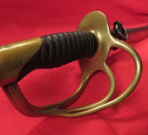 This Model 1860 Light Cavalry saber and scabbard dated 1864 was manufactured by partners Henry Mansfield and Estus Lamb in Forestdale, Rhode Island. Issued to Federal horsemen during the last year of the American Civil War, this is one of 37,500 edged weapons produced for the U.S. Ordnance Department by the firm during the war. The guard, grip, and blade are all firmly attached to each other and exhibit no play whatsoever. Its original buff leather washer is present. The brass guard and pommel has a dull yellowed brassy patina. Its blade length measures approximately 34-3/4 inches, with a 27- inch fuller. Its curved blade has a pleasing light grey sheen which has been maintained in excellent condition with little discoloration and no rust. Along the blade but primarily in the lower region are nicks likely from period use. Marked very clearly on the ricasso is “U.S. / J.C.W. / 1864” with “MANSFIELD & LAMB / FORESTDALE R. I.” within a large oval on the reverse ricasso. Due to a scuff mark, the letters “SFI” of “MANSFIELD” are either partially or not visible at all. Its brass two branch guard and knucklebow is in good shape with no unusual bending. Its domed brass pommel cap is present with one side is inspector stamped “C.E.W”, with a stamped “W” on the other side. The center-swell handle grips have the leather wrap cover that is in very good condition with one slightly deformed area near the pommel as can be seen in the additional images. The leather is tightly wrapped by its original twist brass wire. The original matching steel scabbard has acquired a very pleasing mottled grey patina. There is very minor denting on both sides primarily in the lower half. The two ring bands are present and firmly affixed. Both suspend twin rings measuring approximately 1-1/4 inch (outer diameter). Both rings exhibit slight wear indicative of this rig being belted and worn by the soldier. The scabbard retains its throat collar and exhibits a brazed seam along the bottom length where the metal was folded and joined. This finely crafted Mansfield & Lamb saber and scabbard will be an excellent addition to any Civil War edged weapon or general relic collection.