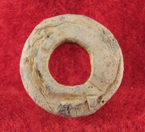 This excavated carved Civil War bullet portion was recovered from a campsite in the area of Cedar Creek, VA. and was acquired directly from the Virginia relic digger. Occasionally bullets are recovered with whittle marks or, in rare instances, intricate carvings, hand-crafted by soldiers using their pocket knives just to pass the time. This is the lower portion of what is believed to be a .58 caliber three ring bullet. The rings are distinct with a visible mold seam. Interestingly, on the interior of the base are four unusual marks, possibly grip marks, spaced almost equally apart. Approximately .576 (dia.) x .339 inch. It has an overall white patina and will be an excellent addition to any excavated carved Civil War bullet or general relic collection.