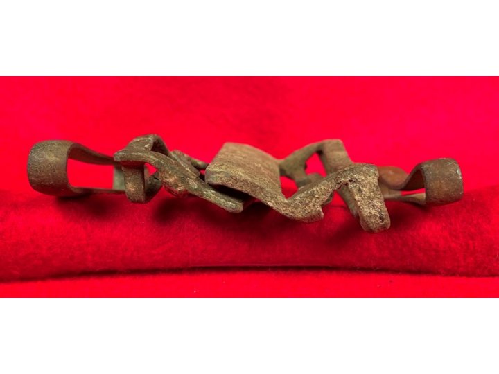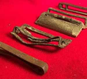 Condition: Very good, excavated, complete. The parts of this four-piece buckle were recovered by the same digger from three different areas and, while the patinas match fairly well, they vary slightly from smooth brown to light-yellow dirty brown to woodsy brownish green. There are no cracks, breaks or repairs on any of the four parts. There are bends in the four parts ranging from slight to moderate with the most noticeable found in the belt keeper bar on the female half. The fit between the male and female halves is close but not complete. There are no repairs.