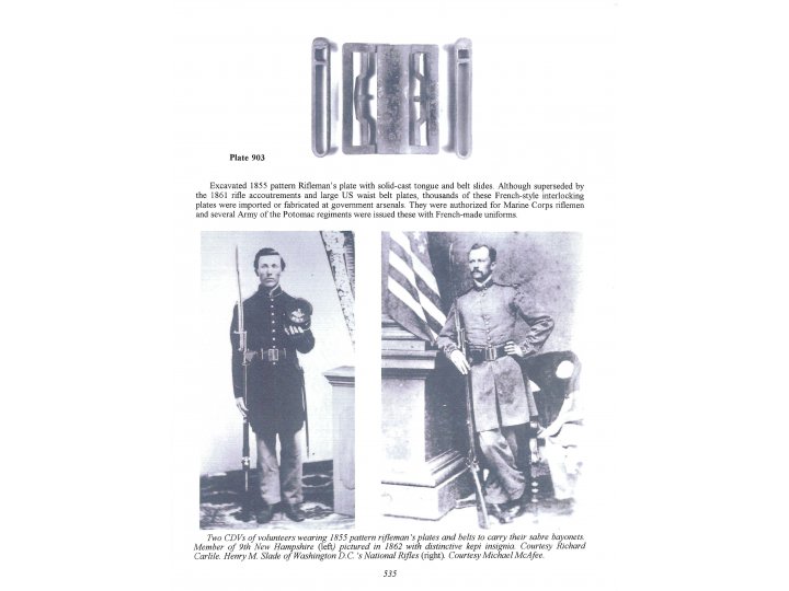 Comments: According to "American Military Belt Plates" by Michael J. O'Donnell and J. Duncan Campbell on page 534, these buckles were a "French design copied from the 1847 chasseur a pied accoutrements with a frog for the sabre bayonet of the Model 1855 rifle and slides which linked with the 1855 pattern knapsack. Rendered obsolete by the Model 1861 rifle accoutrements, but extensive early war use confirmed by photographs and excavations." On page 535, Plate 903, "Although superseded by the 1861 rifle accoutrements and large US waist belt plates, thousands of these French-style interlocking plates were imported or fabricated at government arsenals. They were authorized by Marine Corps riflemen and several Army of the Potomac regiments were issued these with French-made uniforms."